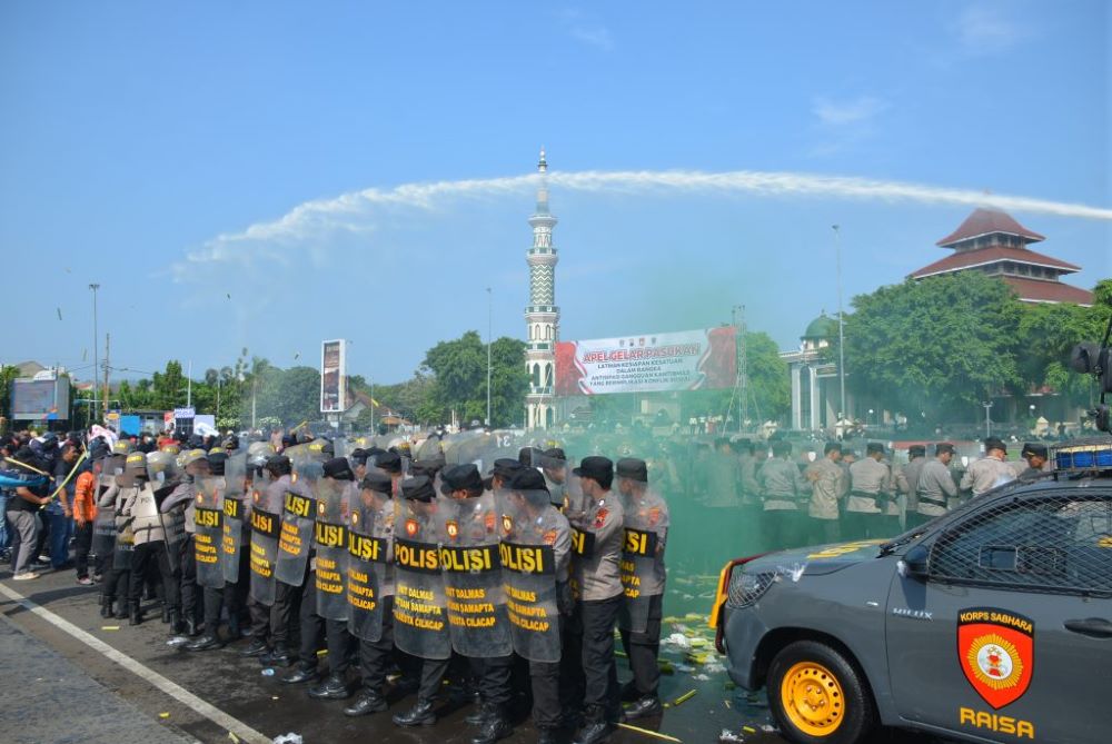 Antisipasi Gejolak Mei, Pemkab dan Polresta Cilacap Gelar Simulasi Sispam Kota di Alun-alun